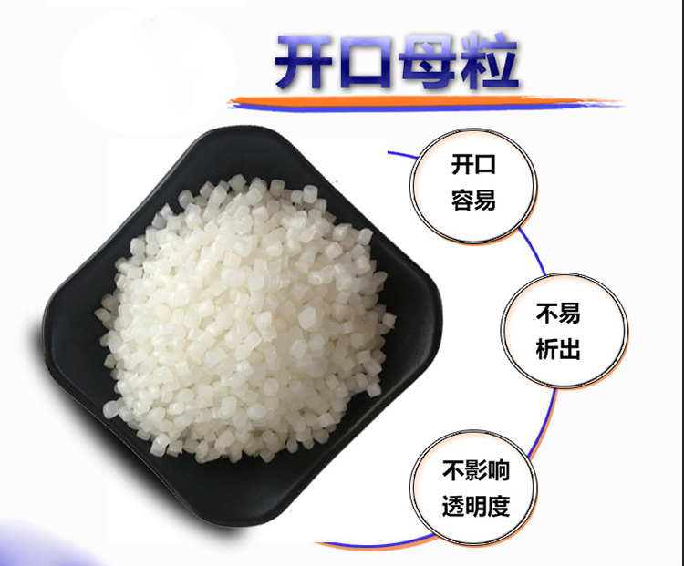 開口母粒是多種高效的專用助劑進(jìn)行復(fù)配,經(jīng)特殊工藝加工而成。可用于聚烯烴(PE、PP)塑料的加工,能有效地提高制品的開口(即抗粘連)性能及加工過程的潤滑性能。